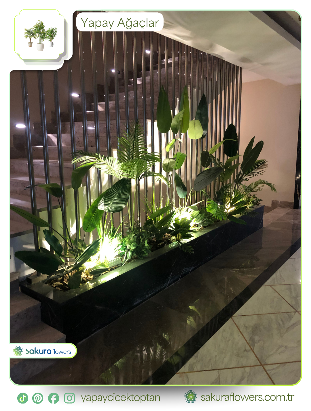 Özellikle restoran, lobi ve geniş koridorlarda kullanılan bu aydınlatmalı tasarım, bitkilerin formunu gece ve gündüz ön plana çıkarır. Hem bölücü bir panel görevi görür hem de dramatik ışıklandırmasıyla mekana derinlik katar.