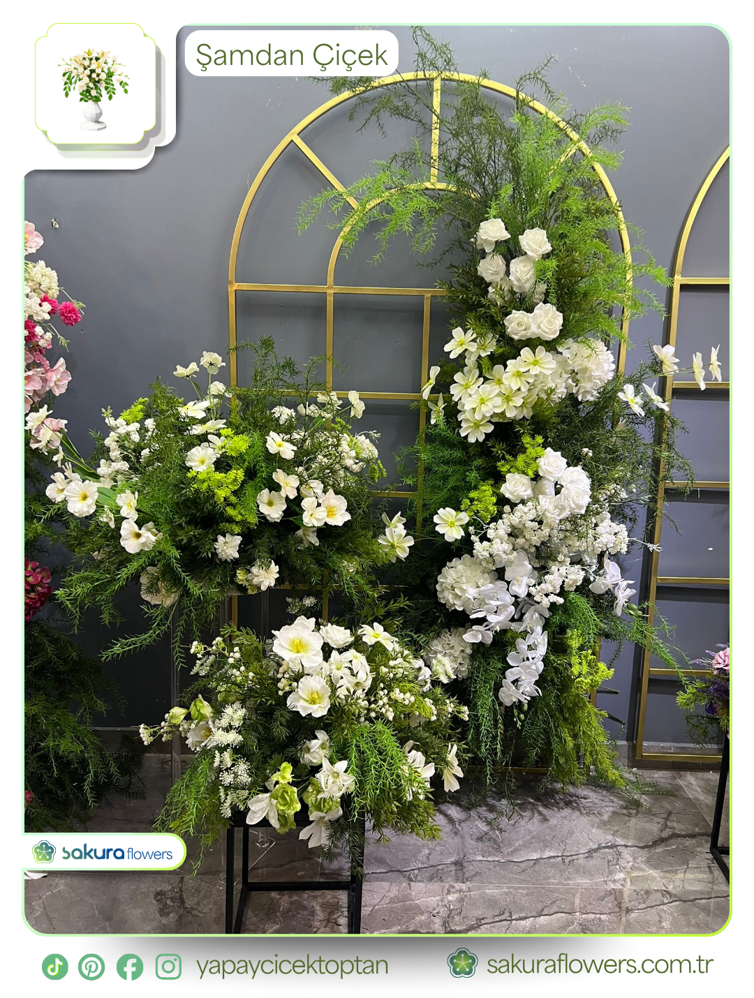 Sakura Flowers tarafından özenle hazırlanan bu set, minimalizmi lüks detaylarla buluşturuyor. Arka planda yer alan zarif gold metal kemer yapısı, asimetrik olarak yerleştirilen canlı görünümlü yapay çiçeklerle tamamlanmıştır.